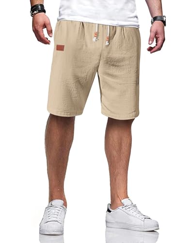 TARAINYA Kurze Hosen Herren Baumwolle Leinen mit Gummizug Freizeithose Shorts Herren Sommer Casual Leicht mit Taschen A Hellkhaki M